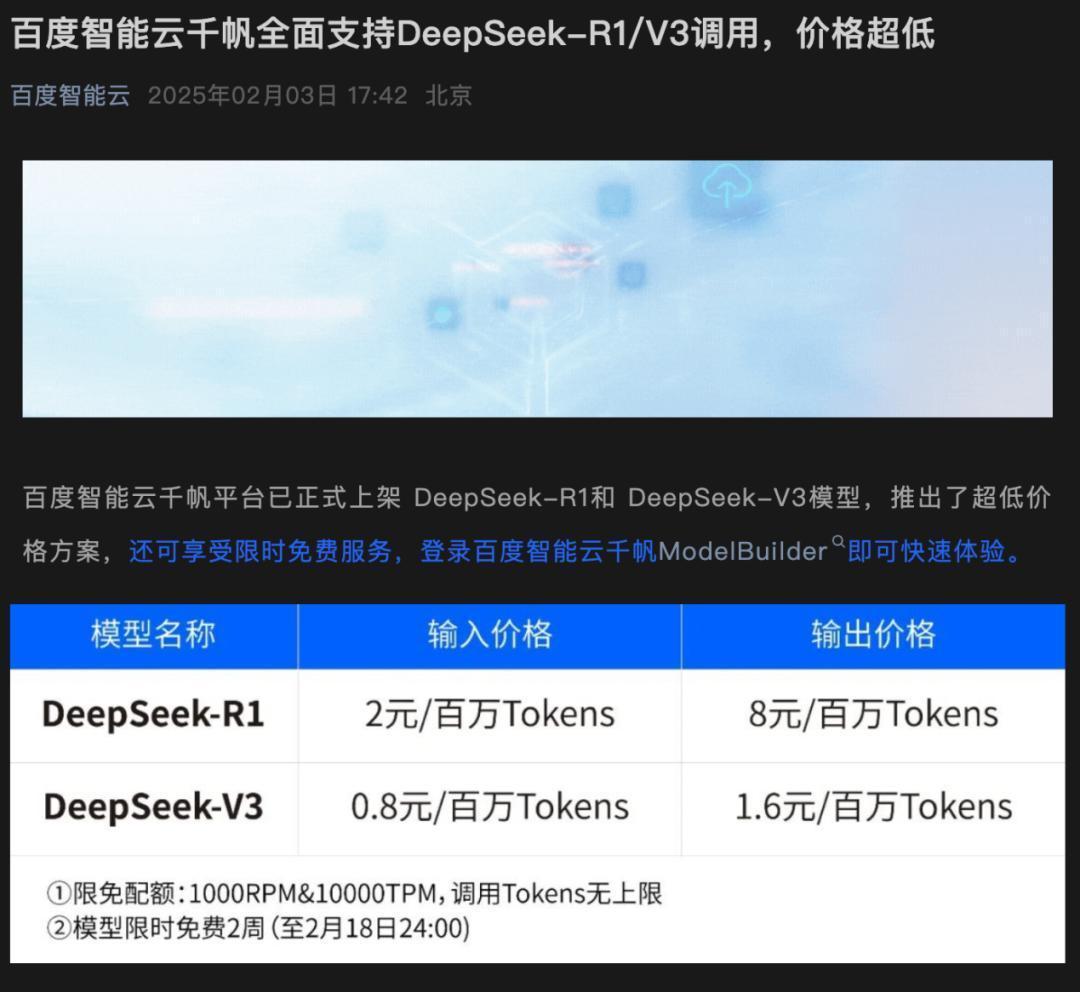 2月3日晚,百度智能云则宣布,百度智能云千帆平台已正式上架DeepSeek-R1和DeepSeek-V3模型。