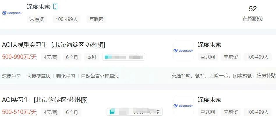 某招聘平台显示,杭州深度求索人工智能(AI)基础技术研究有限公司即DeepSeek(以下简称深度求索公司)发布了多个岗位的招聘信息。